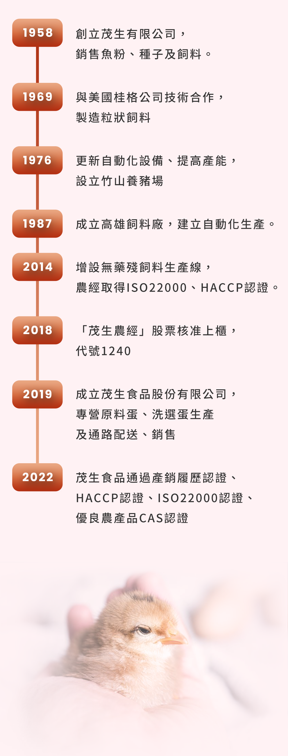 茂生食品以一顆種子的信念,深耕台灣,從進口種子與肥料的小規模貿易起家,成長為今日橫跨飼料生產、農場研發到多角化食品供應鏈的領先企業。我們的歷史,不僅是成長的記錄,更是對品質、對社會、對下一代承諾的證明。