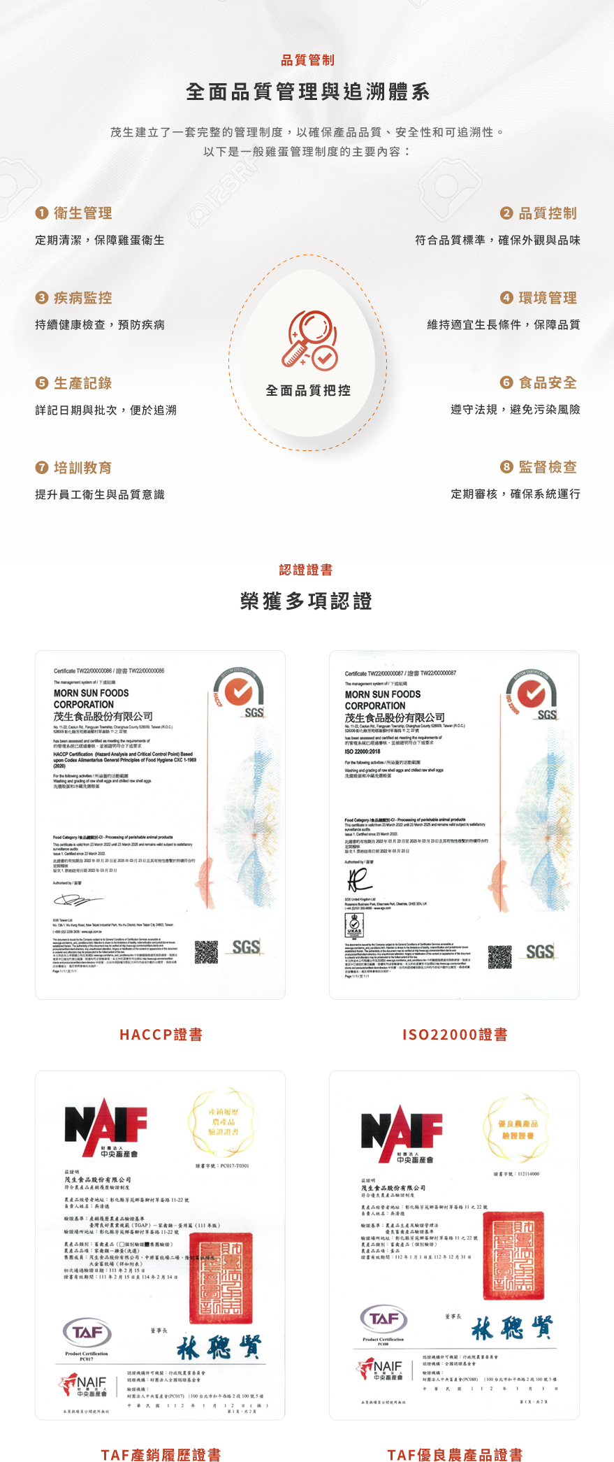 茂生主要營業項目是提供各類雞蛋產品,並確保產品的質量、新鮮度和供應穩定性,以滿足不同客戶的需求。 產品包括以下:原料蛋、土雞蛋、洗選蛋、特殊機能蛋、烏骨雞蛋、加工蛋品、精緻蛋禮盒、客製化蛋品,依客戶需求,提供不同尺寸雞蛋、初生卵等。 茂生的客戶通常包括各種規模和類型的企業和機構,以及個人消費者。 包括如:零售商和超市、餐飲業者、團膳廠商、食品加工廠、學校和機構食堂