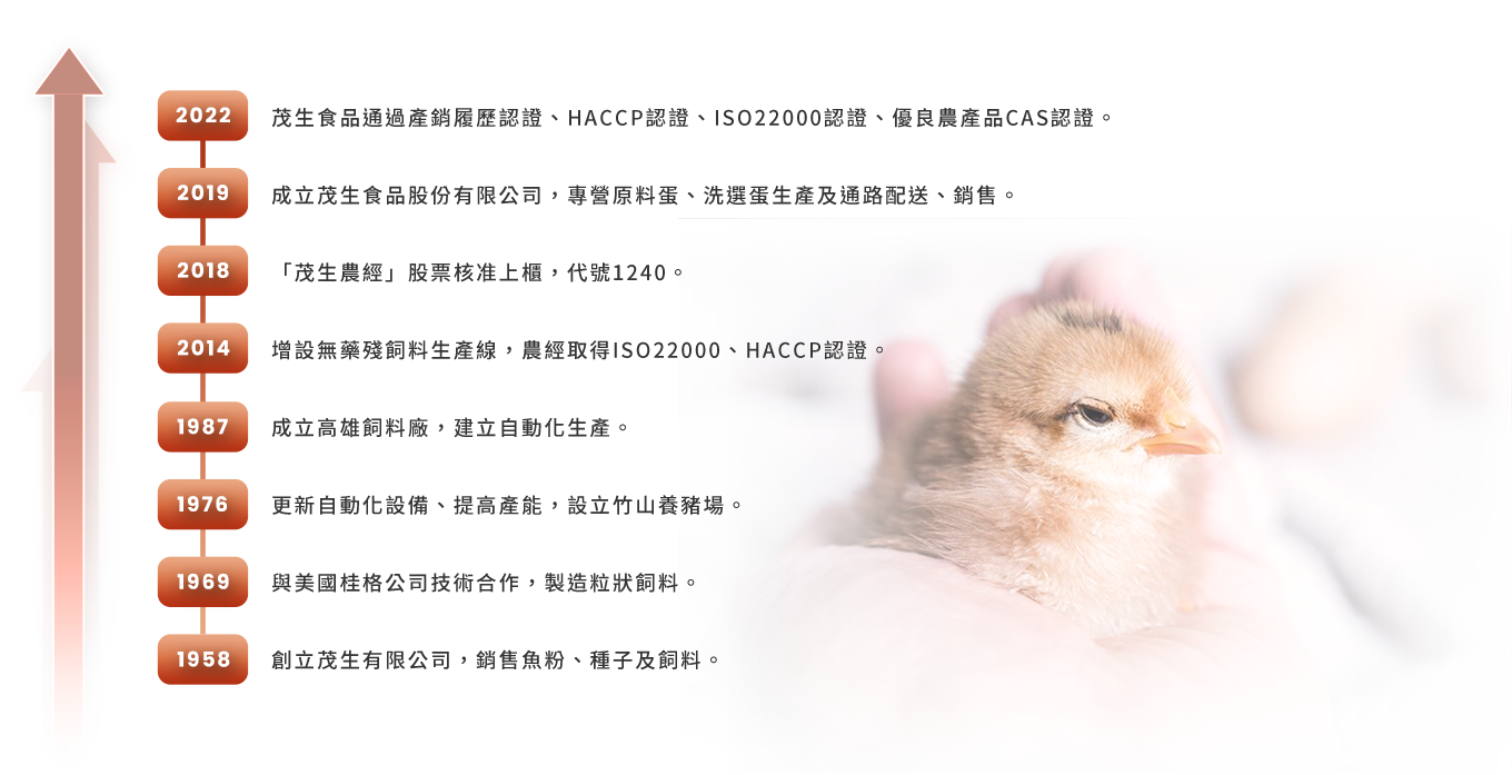茂生食品以一顆種子的信念,深耕台灣,從進口種子與肥料的小規模貿易起家,成長為今日橫跨飼料生產、農場研發到多角化食品供應鏈的領先企業。我們的歷史,不僅是成長的記錄,更是對品質、對社會、對下一代承諾的證明。